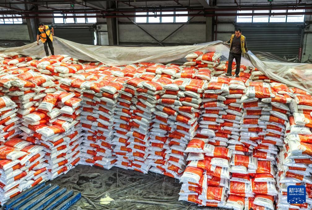 4月16日,在贵州瓮马铁路牛场站,中铁二十局瓮马铁路运营分公司的工人在货仓覆盖化肥防尘布。