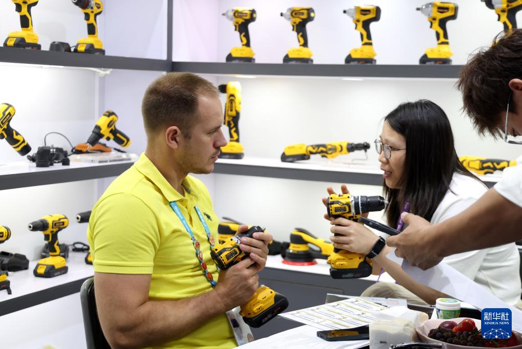 4月19日,采购商在广交会上参观选购电钻。新华社记者 卢汉欣 摄