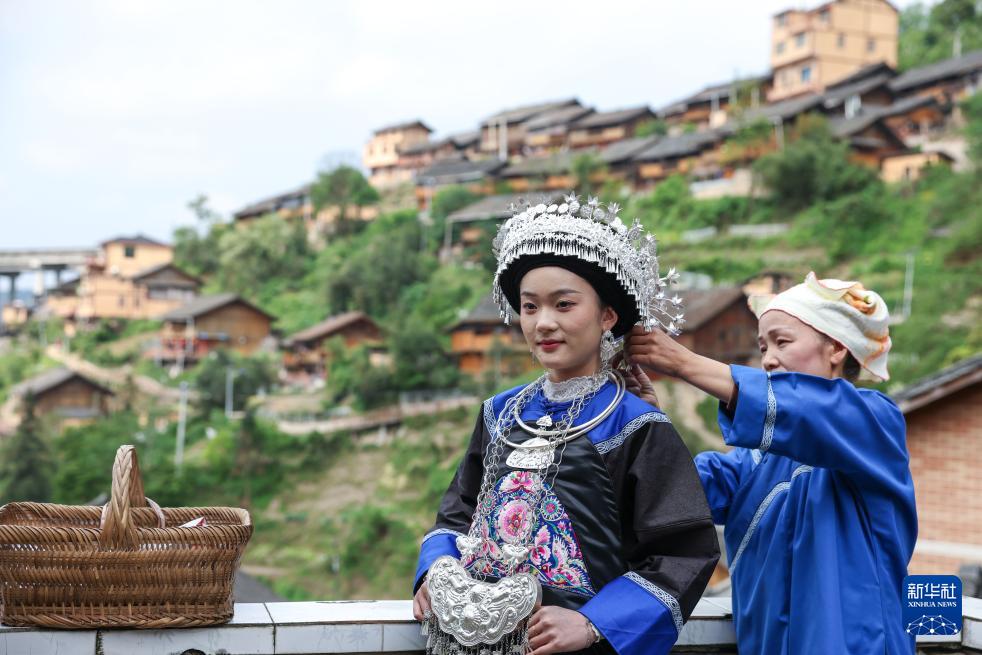 4月19日,在贵州省镇远县报京侗寨,参加“三月三”民俗活动的侗族群众在整理节日服装。