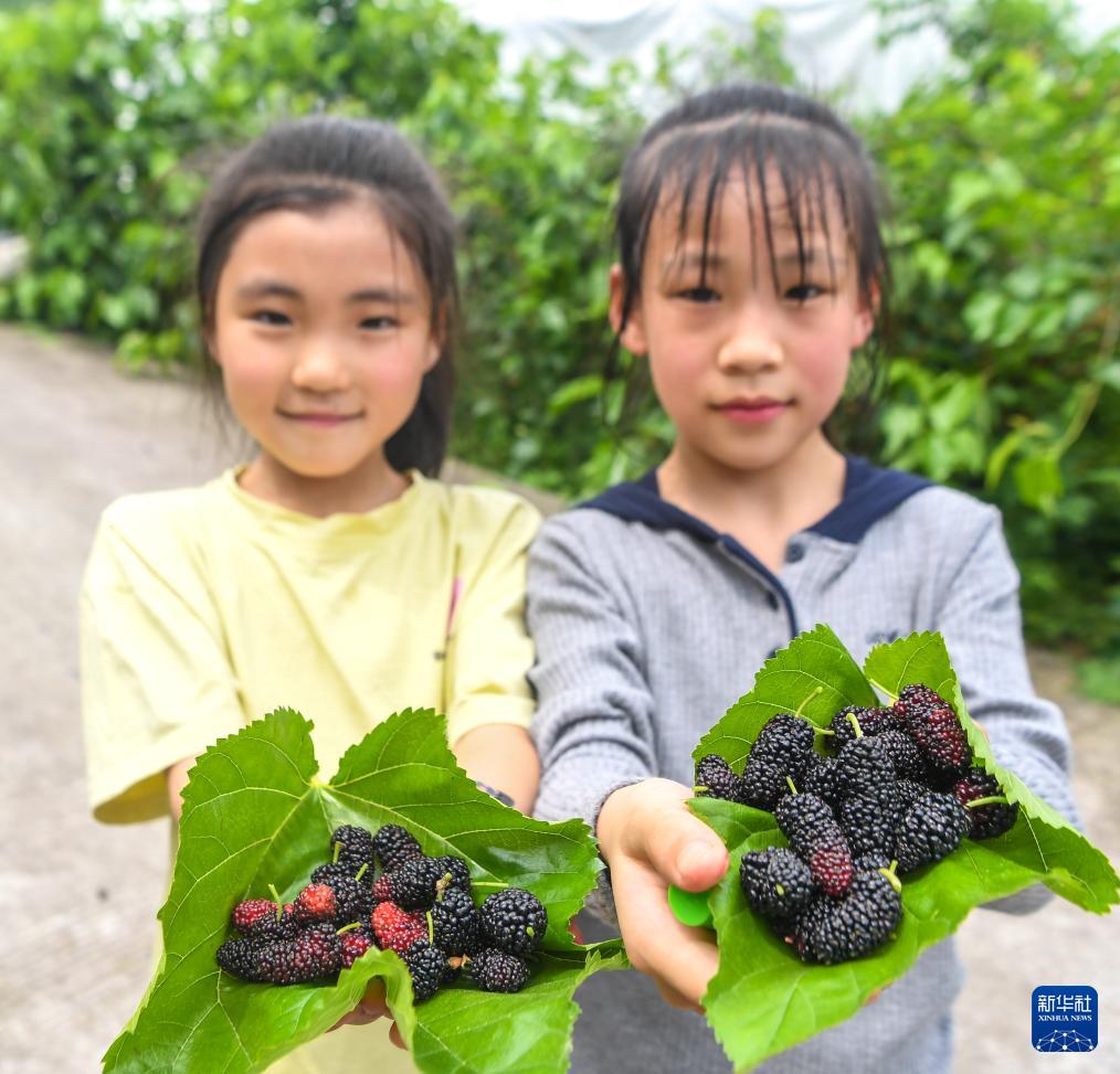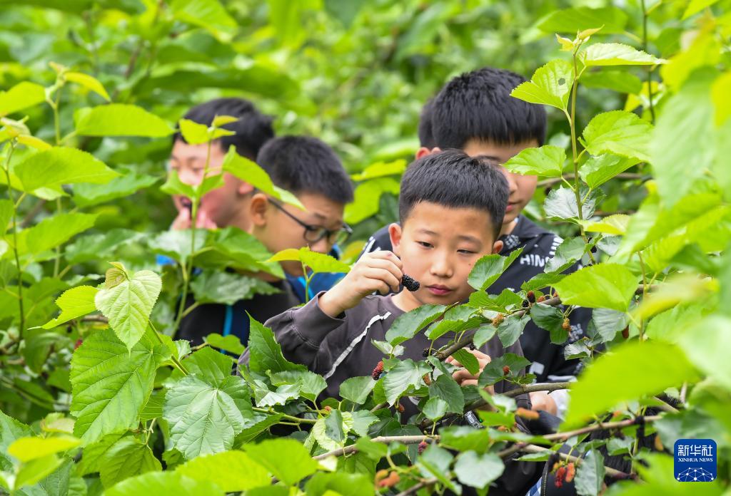 4月19日,小学生在三峡紫果桑采摘园内参加研学活动采摘桑果。 新华社记者 唐奕 摄