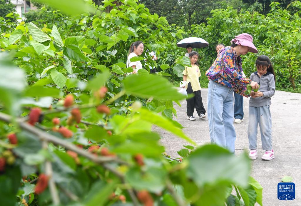 4月19日,游客在三峡紫果桑采摘园内参加研学活动采摘桑果。 新华社记者 唐奕 摄