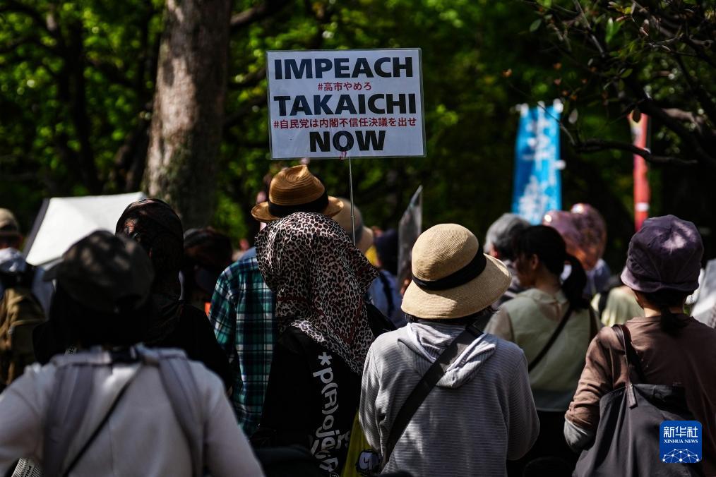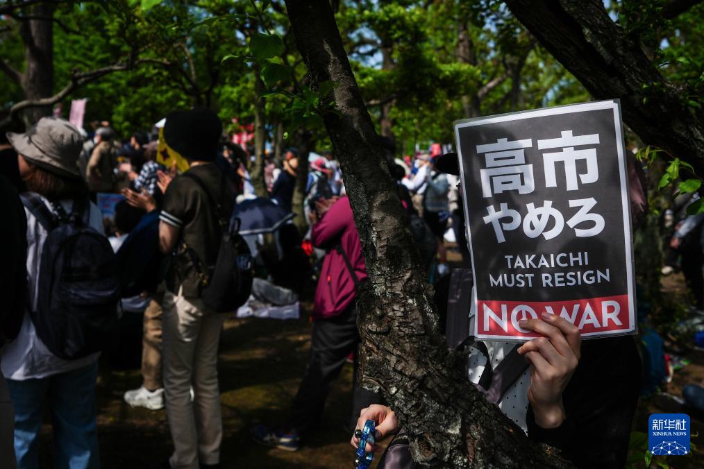 4月19日,人们在位于日本东京的国会议事堂周围参加抗议活动,呼吁守护和平宪法。 日本超3万民众19日下午聚集在国会议事堂周围,强烈抗议高市早苗政府的修宪企图,呼吁守护宪法。 新华社记者 贾浩成 摄