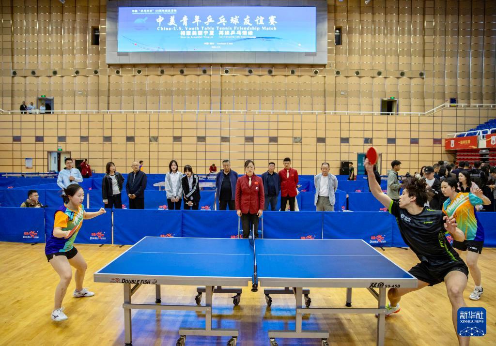 4月16日在宁夏体育馆拍摄的中美青年乒乓球友谊赛。 4月16日,中美青年乒乓球友谊赛在宁夏体育馆举行,两国青年运动员以球会友、切磋技艺,展现了昂扬向上的青春风貌。 新华社记者 杨植森 摄