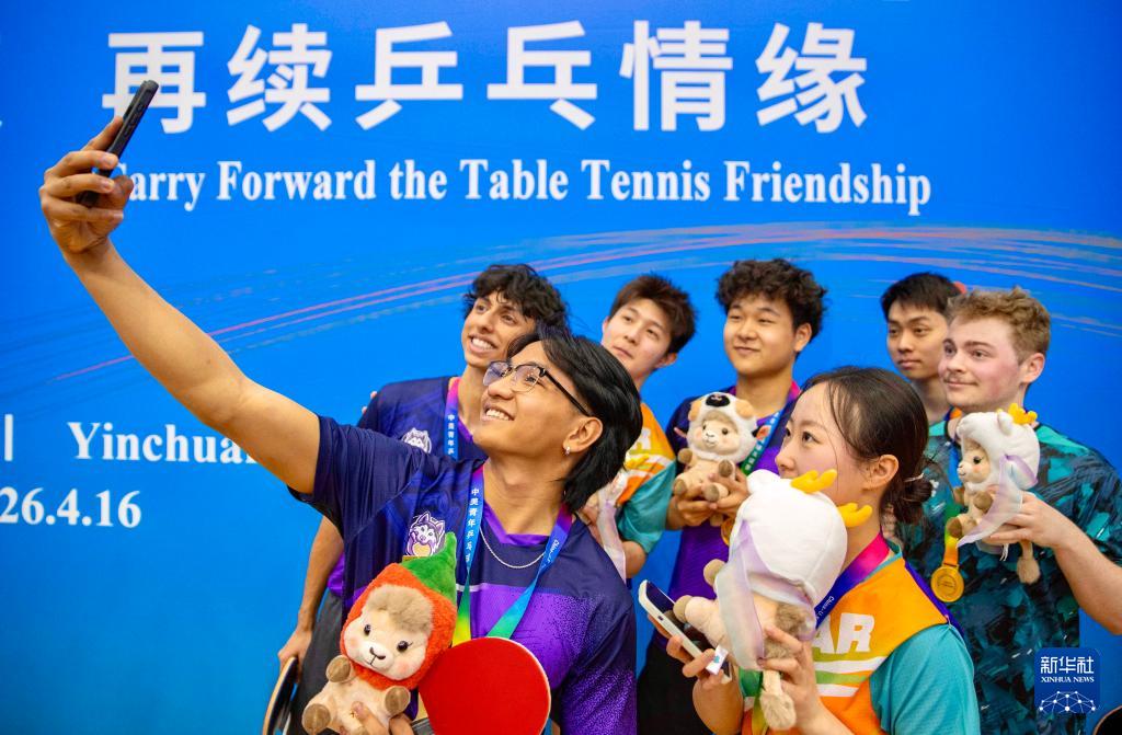 4月16日,在宁夏体育馆,中美青年乒乓球队队员在友谊赛后合影留念。 4月16日,中美青年乒乓球友谊赛在宁夏体育馆举行,两国青年运动员以球会友、切磋技艺,展现了昂扬向上的青春风貌。 新华社记者 杨植森 摄