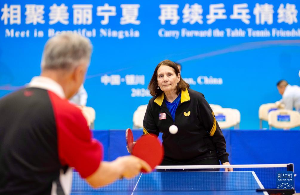 4月16日,中美“乒乓外交”亲历者朱迪·霍夫罗斯特在宁夏体育馆为中美青年乒乓球友谊赛开球。当年15岁的朱迪·霍夫罗斯特随美国乒乓球队访华,成为这一历史性事件的参与者。半个多世纪以来,她长期往返于中美之间,致力于加强中美体育文化交流。 4月16日,中美青年乒乓球友谊赛在宁夏体育馆举行,两国青年运动员以球会友、切磋技艺,展现了昂扬向上的青春风貌。 新华社记者 杨植森 摄
