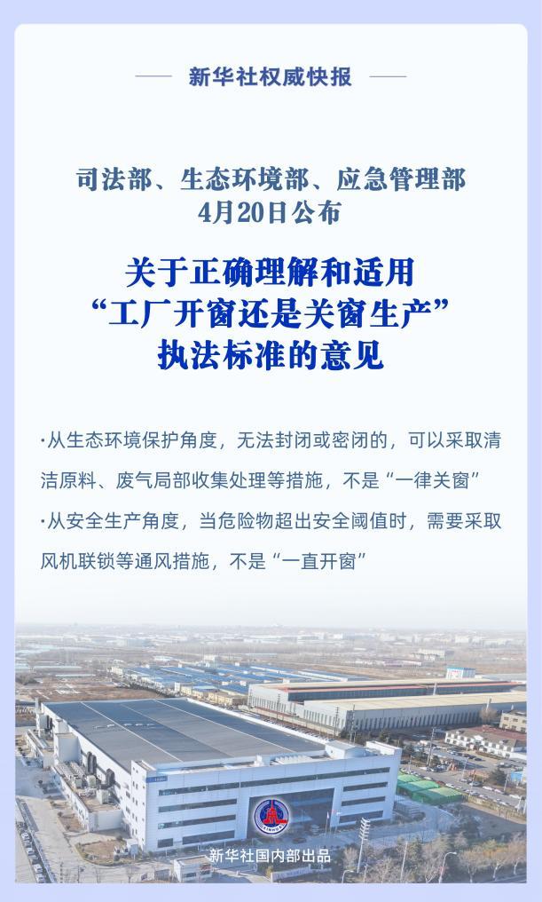 司法部、生态环境部、应急管理部4月20日公布关于正确理解和适用“工厂开窗还是关窗生产”执法标准的意见。 实践中,有企业反映一些基层生态环境部门、应急管理部门的执法人员在入企执法监管中,对“工厂开窗还是关窗生产”要求不一致。对此,意见聚焦“开关窗”核心要求,明确标准内涵及例外规定,从生态环境保护角度,无法封闭或密闭的,可以采取清洁原料、废气局部收集处理等措施,不是“一律关窗”;从安全生产角度,当危险物超出安全阈值时,需要采取风机联锁等通风措施,不是“一直开窗”,要求执法人员根据现场实际研判,为企业生产经营留足空间。 意见指导基层精准化、规范化适用执法标准,推动执法监管既严守安全和生态底线,又坚决杜绝“一刀切”机械执法,全力护航经济社会高质量发展。 记者:齐琪 海报制作:齐琪 新华社国内部出品 |