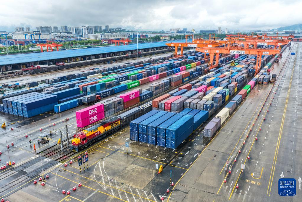 4月21日,西部陆海新通道班列在重庆团结村站等待发车(无人机照片)。