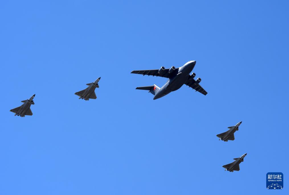 4月22日,第十三批在韩中国人民志愿军烈士遗骸回国。这是接迎第十三批在韩中国人民志愿军烈士遗骸回国的空军运-20B飞抵沈阳,4架歼-20战机护航。新华社记者 李钢 摄 |