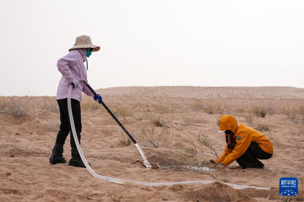 4月20日,在民勤县种林公益发展中心公益林基地种植区,志愿者为树苗浇水。 甘肃省武威市民勤县地处河西走廊东北部,其东、西、北三面被腾格里沙漠和巴丹吉林沙漠包围,是全国防沙治沙重点县。2026年春季,来自全国各地的志愿者又一次齐聚民勤县种林公益发展中心公益林基地,投身“请到民勤种棵树”公益活动,种树护绿,携手共筑生态屏障。 作为“请到民勤种棵树”活动的重要发起人,28岁的民勤县种林公益发展中心负责人仲麟,亲眼见证着这项活动的成长与壮大。自2024年活动发起以来,全国各地的志愿者踊跃参加。据介绍,仅今年已有3万多人次志愿者走进防沙造林一线。截至目前,今年已累计栽植梭梭、白刺、柠条等耐旱树苗超100万株。 目前,今年春季种树工作已接近尾声,当前主要工作是浇水养护,提高树苗存活率。每天上午七点半,志愿者们便从县城的宾馆出发,八点半准时抵达公益林基地,简单组队分工后,便迅速奔赴造林沙地,挖坑、浇水,守护每一株新生的绿意。 “这么多朋友不远千里来民勤,大家心中有爱、做事认真,就像种下的梭梭一样,向下扎根、向上生长。”仲麟说,这些跨越山海前赴后继的身影,正用热爱与坚守,浇灌着沙漠里的绿色希望。 新华社记者 郎兵兵 摄