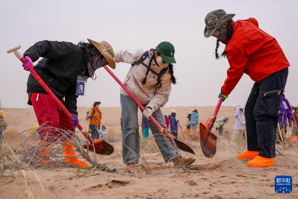 4月20日,在民勤县种林公益发展中心公益林基地种植区,湖南湘潭志愿者陈明知(右)、江西赣州的志愿者洪颖(中)、湖南衡阳志愿者谭佳美三人一组挖储水坑。 甘肃省武威市民勤县地处河西走廊东北部,其东、西、北三面被腾格里沙漠和巴丹吉林沙漠包围,是全国防沙治沙重点县。2026年春季,来自全国各地的志愿者又一次齐聚民勤县种林公益发展中心公益林基地,投身“请到民勤种棵树”公益活动,种树护绿,携手共筑生态屏障。 作为“请到民勤种棵树”活动的重要发起人,28岁的民勤县种林公益发展中心负责人仲麟,亲眼见证着这项活动的成长与壮大。自2024年活动发起以来,全国各地的志愿者踊跃参加。据介绍,仅今年已有3万多人次志愿者走进防沙造林一线。截至目前,今年已累计栽植梭梭、白刺、柠条等耐旱树苗超100万株。 目前,今年春季种树工作已接近尾声,当前主要工作是浇水养护,提高树苗存活率。每天上午七点半,志愿者们便从县城的宾馆出发,八点半准时抵达公益林基地,简单组队分工后,便迅速奔赴造林沙地,挖坑、浇水,守护每一株新生的绿意。 “这么多朋友不远千里来民勤,大家心中有爱、做事认真,就像种下的梭梭一样,向下扎根、向上生长。”仲麟说,这些跨越山海前赴后继的身影,正用热爱与坚守,浇灌着沙漠里的绿色希望。 新华社记者 郎兵兵 摄