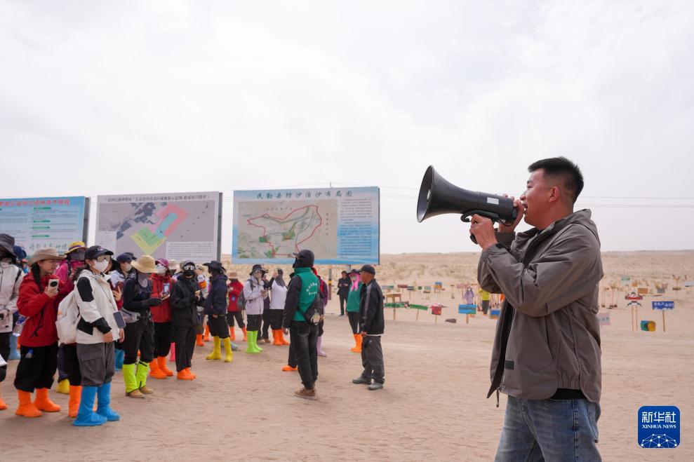 4月21日,志愿者在民勤县种林公益发展中心公益林基地种植区合影。 甘肃省武威市民勤县地处河西走廊东北部,其东、西、北三面被腾格里沙漠和巴丹吉林沙漠包围,是全国防沙治沙重点县。2026年春季,来自全国各地的志愿者又一次齐聚民勤县种林公益发展中心公益林基地,投身“请到民勤种棵树”公益活动,种树护绿,携手共筑生态屏障。 作为“请到民勤种棵树”活动的重要发起人,28岁的民勤县种林公益发展中心负责人仲麟,亲眼见证着这项活动的成长与壮大。自2024年活动发起以来,全国各地的志愿者踊跃参加。据介绍,仅今年已有3万多人次志愿者走进防沙造林一线。截至目前,今年已累计栽植梭梭、白刺、柠条等耐旱树苗超100万株。 目前,今年春季种树工作已接近尾声,当前主要工作是浇水养护,提高树苗存活率。每天上午七点半,志愿者们便从县城的宾馆出发,八点半准时抵达公益林基地,简单组队分工后,便迅速奔赴造林沙地,挖坑、浇水,守护每一株新生的绿意。 “这么多朋友不远千里来民勤,大家心中有爱、做事认真,就像种下的梭梭一样,向下扎根、向上生长。”仲麟说,这些跨越山海前赴后继的身影,正用热爱与坚守,浇灌着沙漠里的绿色希望。 新华社记者 郎兵兵 摄