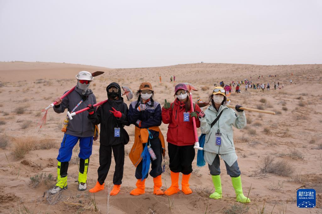 4月21日,志愿者在民勤县种林公益发展中心公益林基地种植区合影。 甘肃省武威市民勤县地处河西走廊东北部,其东、西、北三面被腾格里沙漠和巴丹吉林沙漠包围,是全国防沙治沙重点县。2026年春季,来自全国各地的志愿者又一次齐聚民勤县种林公益发展中心公益林基地,投身“请到民勤种棵树”公益活动,种树护绿,携手共筑生态屏障。 作为“请到民勤种棵树”活动的重要发起人,28岁的民勤县种林公益发展中心负责人仲麟,亲眼见证着这项活动的成长与壮大。自2024年活动发起以来,全国各地的志愿者踊跃参加。据介绍,仅今年已有3万多人次志愿者走进防沙造林一线。截至目前,今年已累计栽植梭梭、白刺、柠条等耐旱树苗超100万株。 目前,今年春季种树工作已接近尾声,当前主要工作是浇水养护,提高树苗存活率。每天上午七点半,志愿者们便从县城的宾馆出发,八点半准时抵达公益林基地,简单组队分工后,便迅速奔赴造林沙地,挖坑、浇水,守护每一株新生的绿意。 “这么多朋友不远千里来民勤,大家心中有爱、做事认真,就像种下的梭梭一样,向下扎根、向上生长。”仲麟说,这些跨越山海前赴后继的身影,正用热爱与坚守,浇灌着沙漠里的绿色希望。 新华社记者 郎兵兵 摄 |