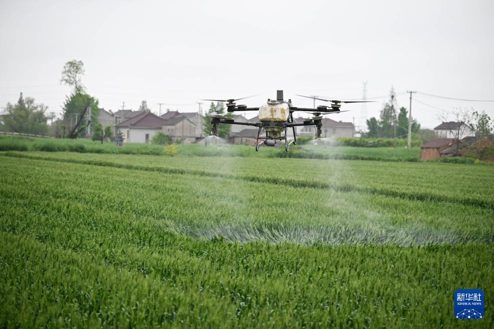 4月22日,在盐城市东台市五烈镇,植保无人机进行飞防作业。 近日,江苏盐城小麦陆续进入抽穗扬花期。受当地稻麦轮作茬口紧张,叠加持续阴雨天气影响,小麦播期推迟,赤霉病发生与倒伏风险叠加,给小麦稳产带来考验。 对此,当地围绕生产关键环节,强化科研单位与企业协同联动,集成应用良种良法配套技术,抢抓关键窗口期开展无人机飞防作业,精准防控赤霉病等病害;同时通过智慧农业应用,加强田间精细化管理,切实为夏粮稳产丰收和农户收益提供有力支撑。 新华社记者 季春鹏 摄