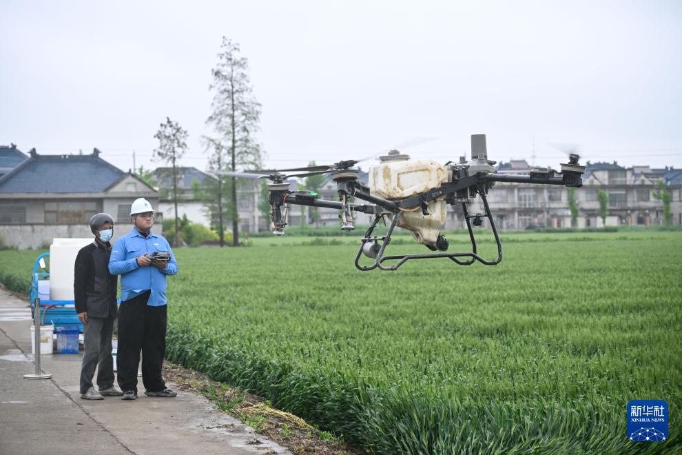 4月22日,在盐城市东台市五烈镇,先正达集团中国旗下中化农业东台MAP技术服务中心农艺师(右)为种粮大户提供“一喷三防”服务。 近日,江苏盐城小麦陆续进入抽穗扬花期。受当地稻麦轮作茬口紧张,叠加持续阴雨天气影响,小麦播期推迟,赤霉病发生与倒伏风险叠加,给小麦稳产带来考验。 对此,当地围绕生产关键环节,强化科研单位与企业协同联动,集成应用良种良法配套技术,抢抓关键窗口期开展无人机飞防作业,精准防控赤霉病等病害;同时通过智慧农业应用,加强田间精细化管理,切实为夏粮稳产丰收和农户收益提供有力支撑。 新华社记者 季春鹏 摄