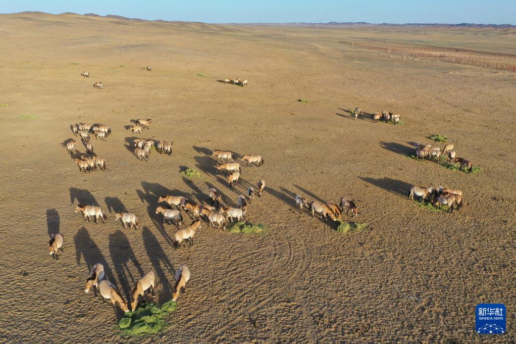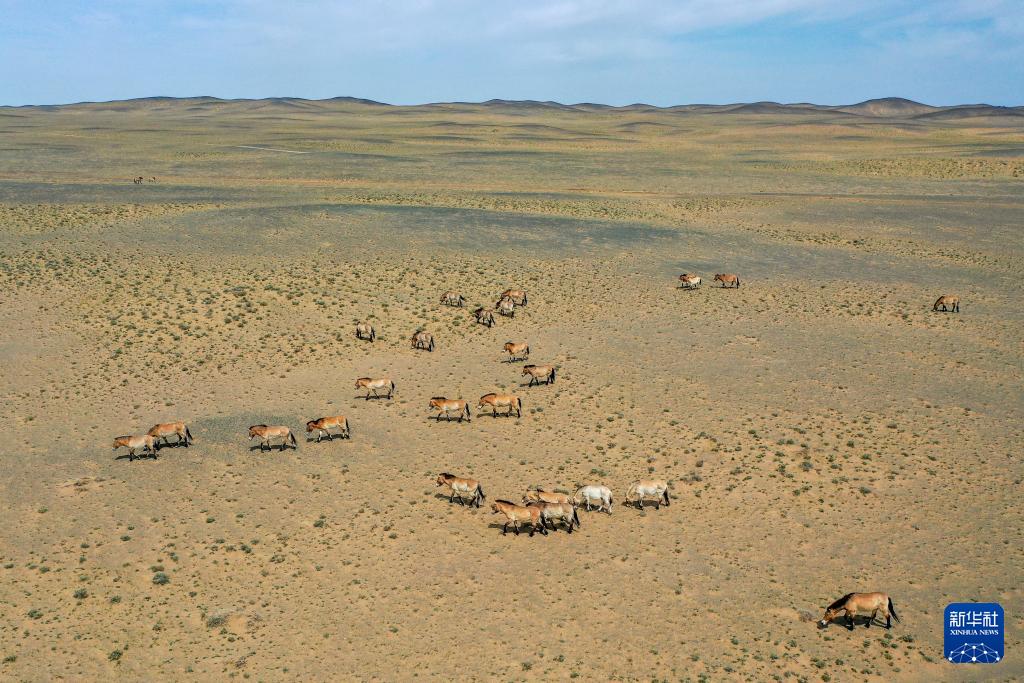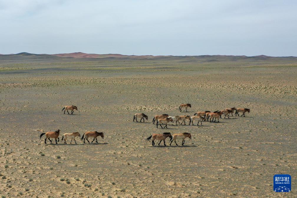 这是在新疆卡拉麦里山有蹄类野生动物自然保护区拍摄的回归野外的普氏野马(4月22日摄,无人机照片)。 4月22日,新疆卡拉麦里山有蹄类野生动物自然保护区迎来新成员——30匹普氏野马完成野化训练,成功放归野外。 据介绍,2025年10月下旬,30匹普氏野马分三批次从180公里外的野马繁育研究所运抵监测站,它们在围栏区内与冬季返回补饲的百余匹普氏野马自然融合,经过一个冬季的适应,以及种群内的自由竞争,逐渐形成新的稳定群体。 普氏野马是地球上唯一存活的野生马种,曾一度濒临野外灭绝。1985年,我国启动了“野马返乡”计划,从国外引回普氏野马并在新疆建立亚洲最大的普氏野马繁殖基地。 历经多年保护繁育、野化放归工作,我国普氏野马人工繁育与野外种群规模持续扩大,生态适应性不断提升。自2001年首次放归27匹普氏野马至今,新疆放归普氏野马总数达到176匹,野外种群数量稳定增长,已经达到392匹。 新华社记者 丁磊 摄
