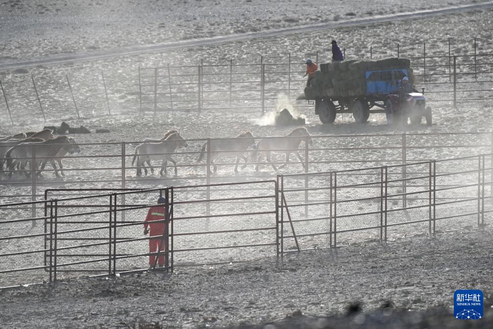 在新疆卡拉麦里山有蹄类野生动物自然保护区,工作人员投放草料将即将野放的普氏野马分群(4月21日摄)。 4月22日,新疆卡拉麦里山有蹄类野生动物自然保护区迎来新成员——30匹普氏野马完成野化训练,成功放归野外。 据介绍,2025年10月下旬,30匹普氏野马分三批次从180公里外的野马繁育研究所运抵监测站,它们在围栏区内与冬季返回补饲的百余匹普氏野马自然融合,经过一个冬季的适应,以及种群内的自由竞争,逐渐形成新的稳定群体。 普氏野马是地球上唯一存活的野生马种,曾一度濒临野外灭绝。1985年,我国启动了“野马返乡”计划,从国外引回普氏野马并在新疆建立亚洲最大的普氏野马繁殖基地。 历经多年保护繁育、野化放归工作,我国普氏野马人工繁育与野外种群规模持续扩大,生态适应性不断提升。自2001年首次放归27匹普氏野马至今,新疆放归普氏野马总数达到176匹,野外种群数量稳定增长,已经达到392匹。 新华社记者 丁磊 摄