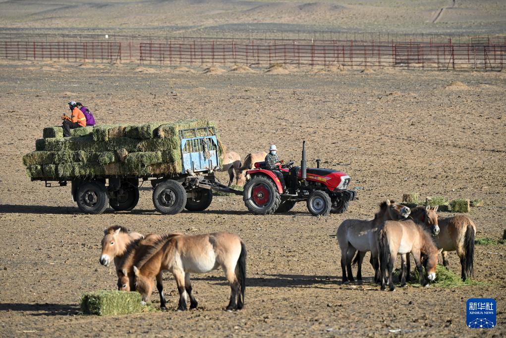 在新疆卡拉麦里山有蹄类野生动物自然保护区,工作人员为普氏野马投放草料(4月21日摄)。 4月22日,新疆卡拉麦里山有蹄类野生动物自然保护区迎来新成员——30匹普氏野马完成野化训练,成功放归野外。 据介绍,2025年10月下旬,30匹普氏野马分三批次从180公里外的野马繁育研究所运抵监测站,它们在围栏区内与冬季返回补饲的百余匹普氏野马自然融合,经过一个冬季的适应,以及种群内的自由竞争,逐渐形成新的稳定群体。 普氏野马是地球上唯一存活的野生马种,曾一度濒临野外灭绝。1985年,我国启动了“野马返乡”计划,从国外引回普氏野马并在新疆建立亚洲最大的普氏野马繁殖基地。 历经多年保护繁育、野化放归工作,我国普氏野马人工繁育与野外种群规模持续扩大,生态适应性不断提升。自2001年首次放归27匹普氏野马至今,新疆放归普氏野马总数达到176匹,野外种群数量稳定增长,已经达到392匹。 新华社记者 丁磊 摄