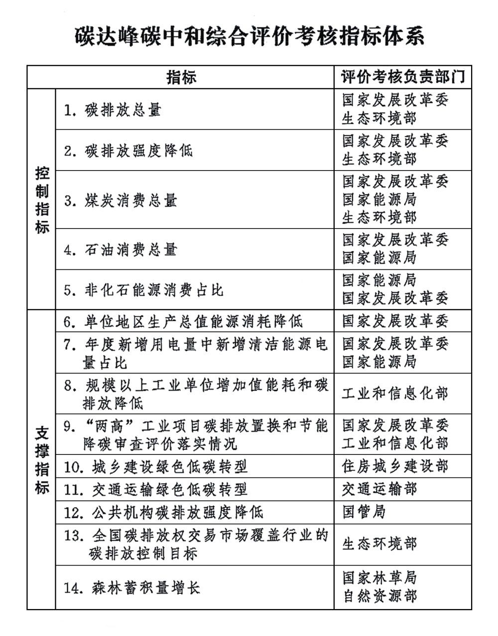 近日,中共中央办公厅、国务院办公厅印发《碳达峰碳中和综合评价考核办法》,并发出通知,要求各地区各部门认真遵照执行。 《碳达峰碳中和综合评价考核办法》全文如下。 碳达峰碳中和综合评价考核办法 (2026年2月26日中共中央政治局常委会会议审议批准 2026年4月12日中共中央办公厅、国务院办公厅发布) 第一章 总则 第一条 为了发挥碳达峰碳中和的战略牵引作用,加快构建碳排放总量和强度双控制度体系,推动地方党委和政府树立和践行正确政绩观、坚决扛起碳达峰碳中和责任,根据《中共中央、国务院关于完整准确全面贯彻新发展理念做好碳达峰碳中和工作的意见》、《中共中央、国务院关于加快经济社会发展全面绿色转型的意见》和有关规定,制定本办法。 第二条 本办法适用于自2026年度起对各省(自治区、直辖市)党委和政府落实碳达峰碳中和目标任务,加快经济社会发展全面绿色转型进展情况的评价考核。 第三条 在党中央集中统一领导下,评价考核工作由中央组织部统筹指导,由国家发展改革委会同有关部门实施。 第四条 评价考核实行党政同责、一岗双责,坚持统筹兼顾、客观公正、科学规范、注重实效的工作原则。 第二章 评价考核内容 第五条 评价考核紧紧围绕贯彻落实党中央、国务院关于碳达峰碳中和的决策部署以及应对气候变化国家自主贡献目标开展,推动各省(自治区、直辖市)落实碳排放总量和强度双控目标。 第六条 评价考核设置控制指标、支撑指标。 控制指标包括碳排放总量、碳排放强度降低、煤炭消费总量、石油消费总量、非化石能源消费占比等指标。 支撑指标包括节能、工业、城乡建设、交通运输、公共机构、碳排放权交易等领域具有代表性且对碳达峰碳中和具有支撑作用的指标。 第七条 “十五五”时期,国家发展改革委应当会同有关部门围绕如期实现2030年前碳达峰目标,制定“十五五”碳达峰行动方案,确保实现2030年碳排放强度比2005年降低65%以上、2030年非化石能源消费占比达到25%等目标,实现煤炭消费总量和石油消费总量达峰,合理控制煤电装机规模和发电量,力争年度新增清洁能源电量逐步覆盖全社会新增用电量。 第八条 “十五五”时期,各省(自治区、直辖市)党委和政府应当制定省级碳达峰行动方案,按照国家层面目标确定本地区各项指标的五年目标和分年度目标,并提出相应任务举措。 省级行动方案应当按时制定完成,经国家发展改革委会同有关部门衔接审核后,报党中央、国务院审定,并作为后续对各省(自治区、直辖市)开展评价考核的依据。 国家发展改革委会同有关部门衔接审核省级行动方案时,应当围绕实现国家层面目标,督促地方落实新(改、扩)建“两高”工业项目实施碳排放等量或者减量置换等要求,并综合考虑不同类型地区的主体功能定位、产业和能源结构、自然资源禀赋等因素,统筹好刚性约束和弹性调控,体现差异化要求。 第九条 “十六五”时期起,每个五年规划期的第一年,国家发展改革委应当会同有关部门按照党中央、国务院确定的阶段性目标制定全国碳排放控制行动方案,各省(自治区、直辖市)应当制定省级碳排放控制行动方案,推动逐步实现碳中和。 第十条 国家发展改革委应当会同有关部门及时制定评价考核年度实施方案,细化工作举措,明确各项指标的评价考核细则,并可以根据形势和工作需要适时调整完善指标体系。 第三章 评价考核程序 第十一条 评价考核工作按照年度开展,于评价考核年度次年具体实施。 第十二条 各省(自治区、直辖市)党委和政府对本地区年度碳达峰碳中和工作开展自评,并按时将自评报告报党中央、国务院,抄送国家发展改革委等评价考核负责部门。 第十三条 各有关部门对所负责指标全国年度进展情况进行评估,对各省(自治区、直辖市)年度进展情况进行评价。对各省(自治区、直辖市)单一指标的评价结果分为达标、不达标。评价结果为“不达标”的,有关指标评价考核负责部门应当剖析该省(自治区、直辖市)工作中存在的问题、原因并提出改进建议,形成书面意见。各有关部门应当按时将评价结果以及书面意见送国家发展改革委。 第十四条 国家发展改革委会同有关部门采取实地抽查、委托第三方核查等方式,对有关省(自治区、直辖市)工作进展、任务落实、目标完成以及数据真实性等情况进行实地核验。 第十五条 国家发展改革委结合地方自评、部门评价、实地核验等情况,按照优秀、合格、不合格3个等次提出各省(自治区、直辖市)年度碳达峰碳中和综合评价考核结果建议,商中央组织部后按照程序报党中央、国务院。 控制指标和支撑指标全部达标的省(自治区、直辖市),评价考核结果为“优秀”;1项及以上控制指标不达标或者3项及以上支撑指标不达标的省(自治区、直辖市),评价考核结果为“不合格”;其余为“合格”。 第四章 评价考核结果运用 第十六条 评价考核结果经党中央、国务院审定后,由中央组织部、国家发展改革委按照程序向各省(自治区、直辖市)党委和政府反馈,并送中央纪委国家监委。 第十七条 根据评价考核结果对有关省(自治区、直辖市)进行约谈、通报提醒、通报表扬。 评价考核结果为“不合格”的,由中央组织部、国家发展改革委督促有关省(自治区、直辖市)党委和政府在接到结果反馈后30个工
