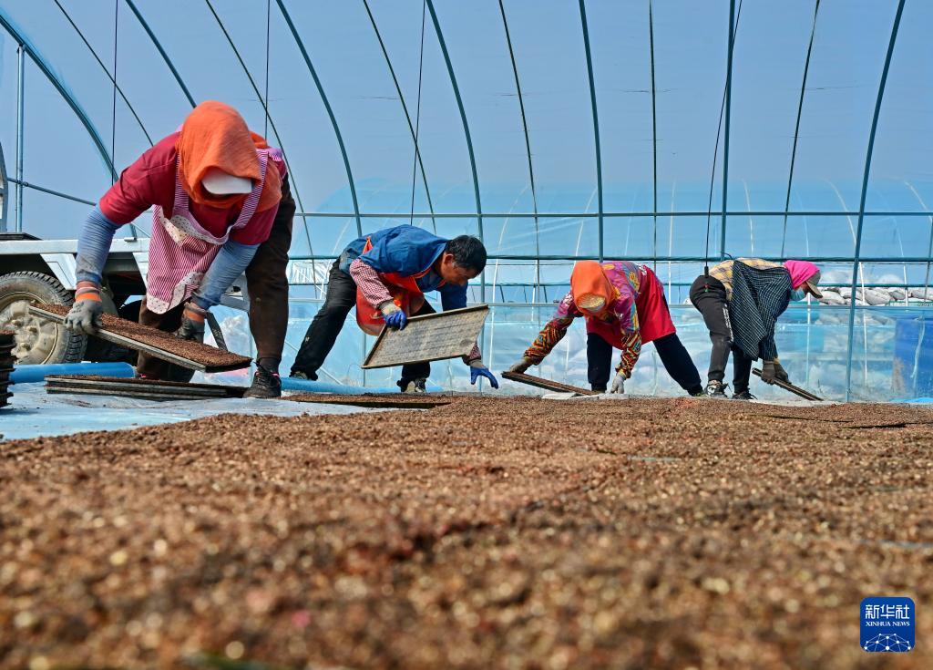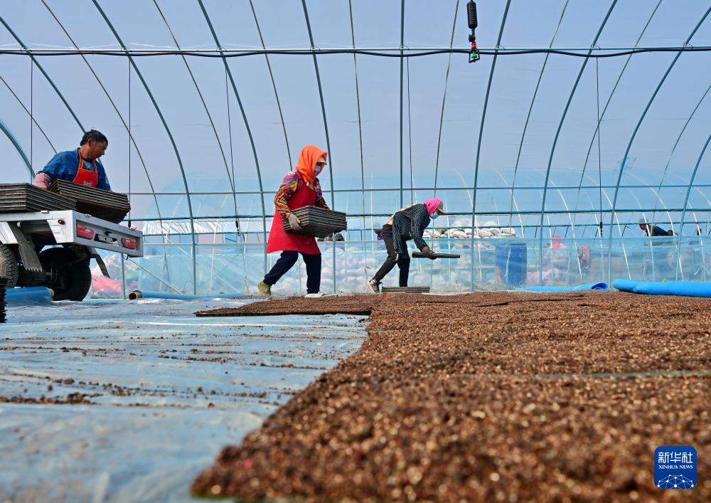 4月23日,唐山市曹妃甸区第四农场的农民在摆放水稻育秧盘。 时下正值春季农事关键期,河北省唐山市曹妃甸的农民抢抓农时进行水稻育秧等工作,田间地头一派繁忙景象。 新华社记者 杨世尧 摄