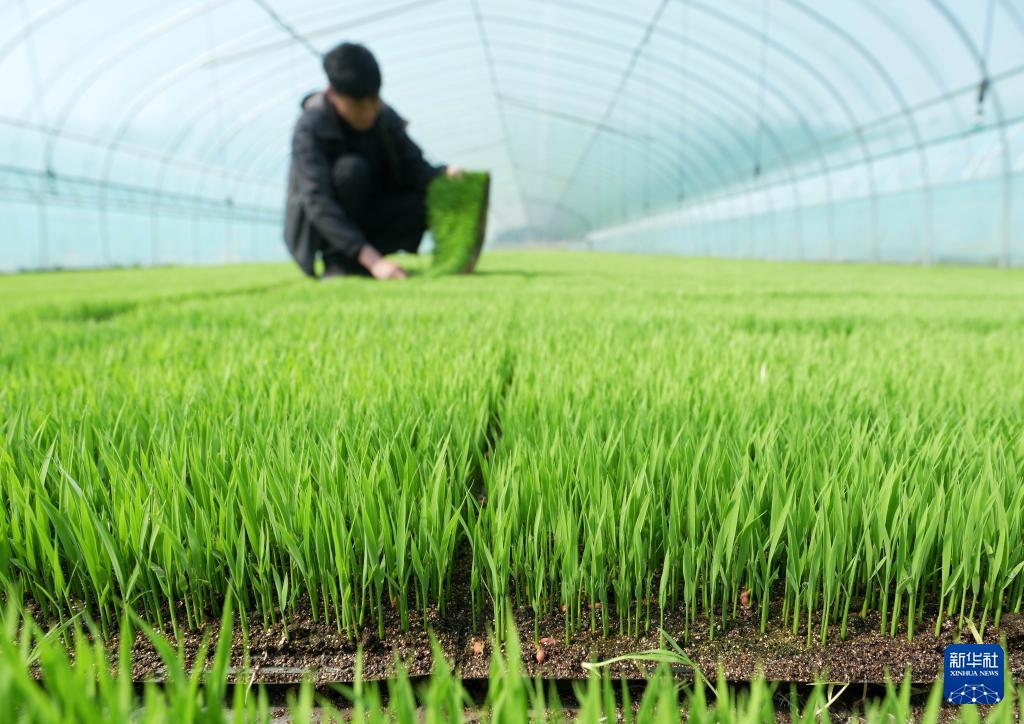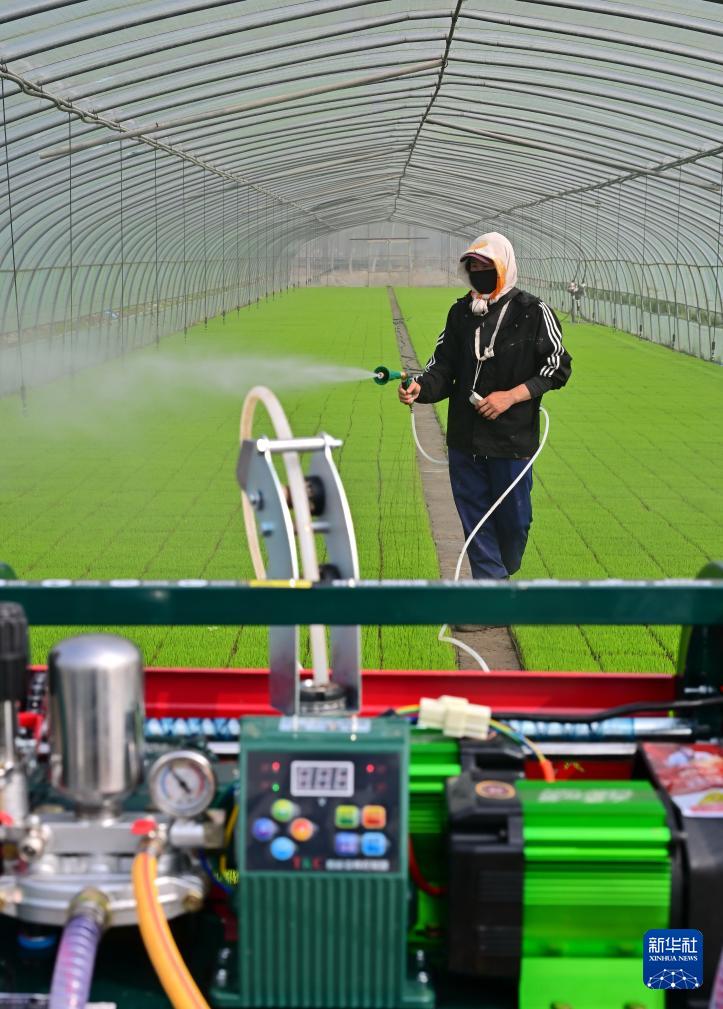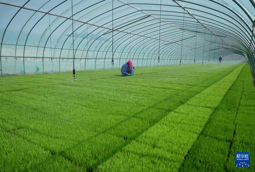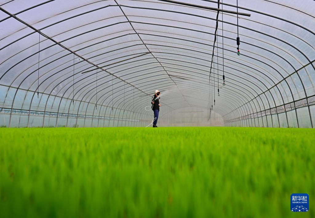 4月23日,唐山市曹妃甸区第四农场的农民在大棚里管护水稻秧苗。 时下正值春季农事关键期,河北省唐山市曹妃甸的农民抢抓农时进行水稻育秧等工作,田间地头一派繁忙景象。 新华社记者 杨世尧 摄