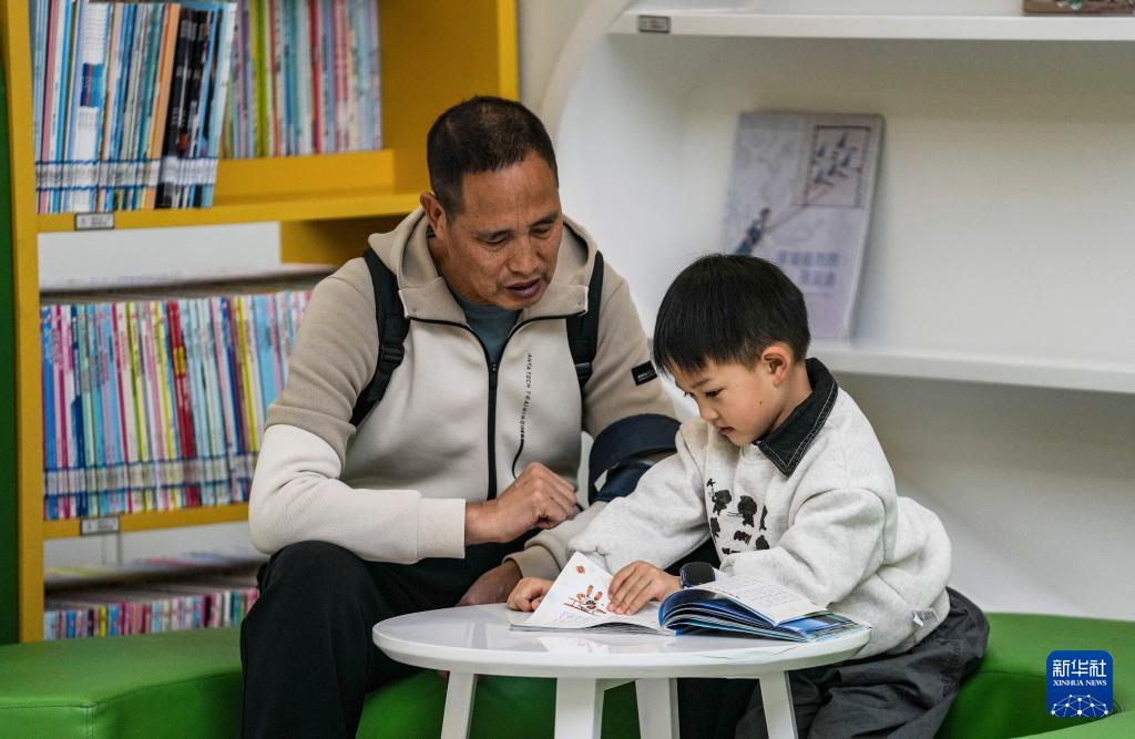 4月23日,在贵州省图书馆内,小朋友在家人的陪伴下读书。