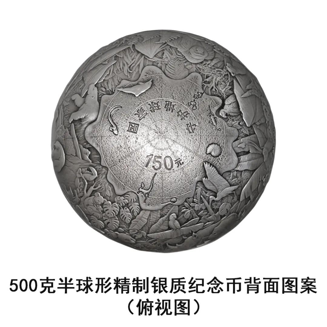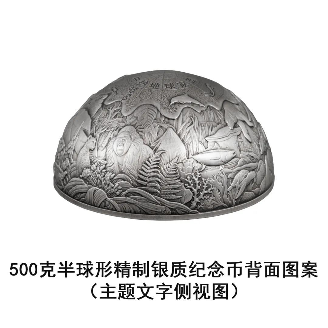 500克半球形银质纪念币背面图案为地球动植物代表性物种,以及化石、经纬线等组合设计,并刊“守护地球家园”字样及面额。