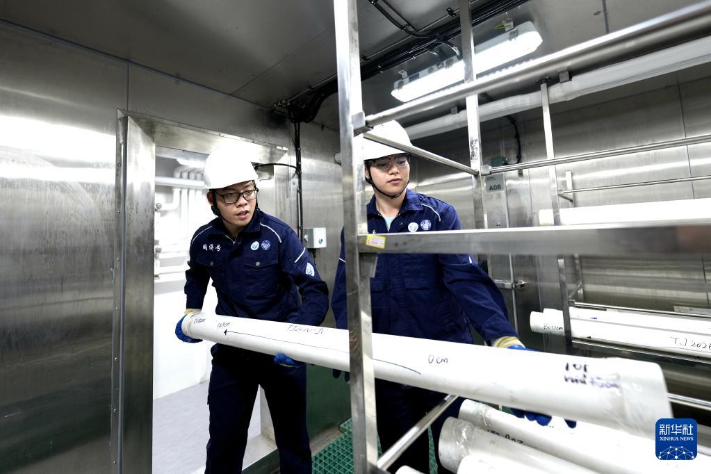 4月25日,同济大学海洋与地球科学学院研究生王子轩(左)和张奕栩(右)在“同济”号冷藏库放置沉积物样品。 “同济”号是我国首艘海洋级智能综合科考船,目前正在南海北部执行春季航次任务,来自同济大学、中国科学技术大学等单位的30名考察队员,在船上开展以“追踪海洋碳循环地质指标与记录”为主题的“追碳”科考。 新华社记者 张建松 摄