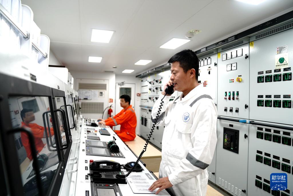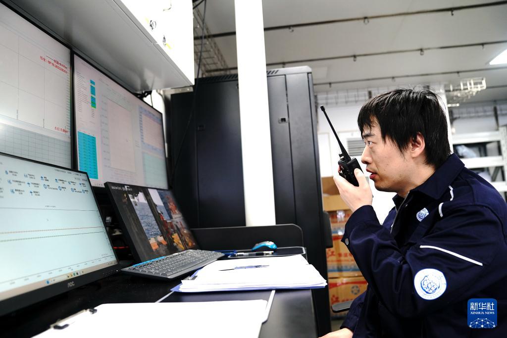 4月24日,“同济”号轮机长赵川在机舱集控室与驾驶台沟通科考站位工作。 “同济”号是我国首艘海洋级智能综合科考船,目前正在南海北部执行春季航次任务,来自同济大学、中国科学技术大学等单位的30名考察队员,在船上开展以“追踪海洋碳循环地质指标与记录”为主题的“追碳”科考。 新华社记者 张建松 摄