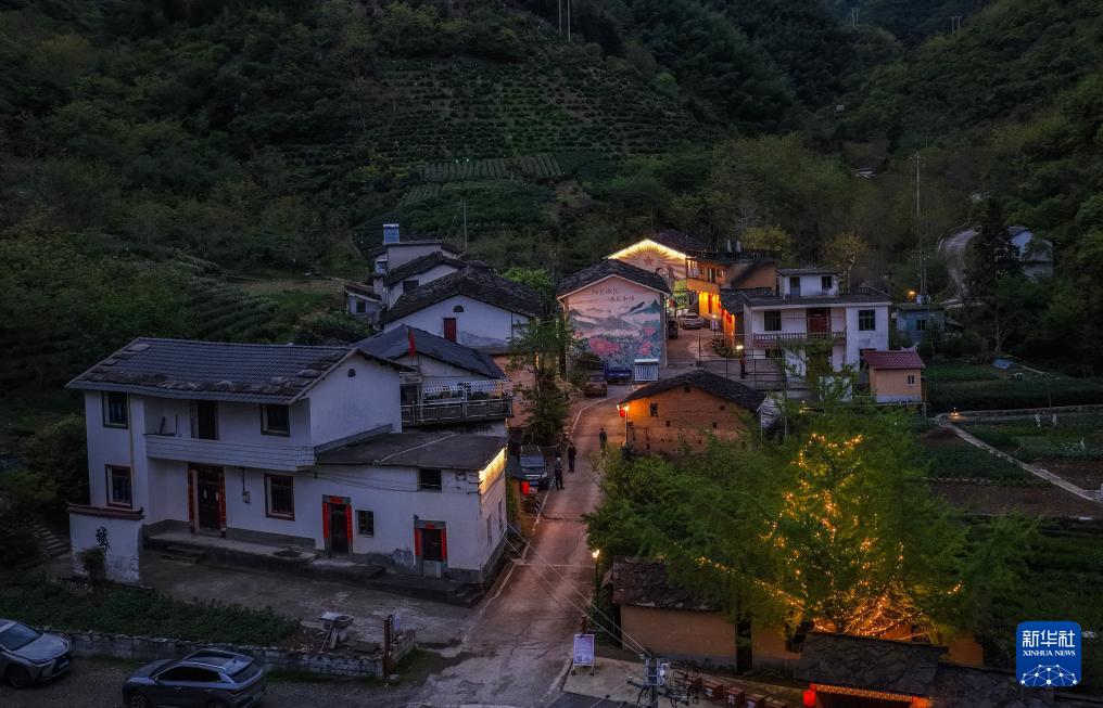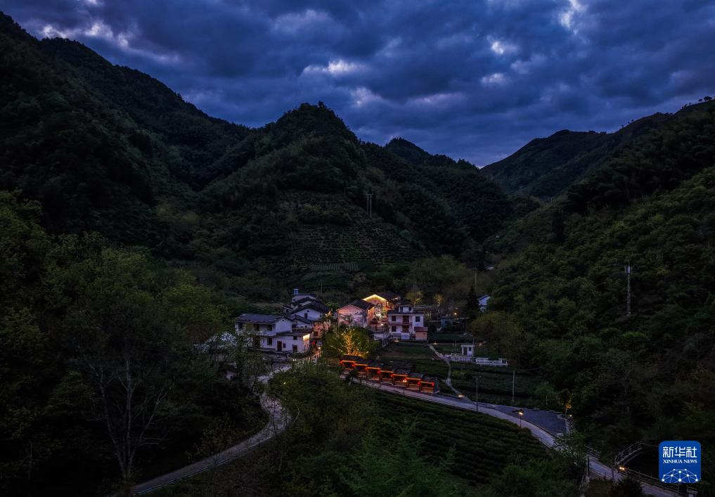 夜色中的淳安县屏门乡金陵村(4月24日摄,无人机照片)。 近期,浙江省杭州市淳安县屏门乡金陵村的数百亩高山野生杜鹃热烈绽放,吸引各地游客前来观赏。 淳安县金陵村海拔1000多米,是淳安海拔最高的村落之一。近年来,该村依托高山上自然生长的数百亩杜鹃及茶叶、茶油、竹笋等特色农产品,通过修缮盘山公路、开辟露营基地、搭建观景平台、发展共享民宿,逐渐形成以登山观景、避暑养生为特色的农文旅产业,带动山村村民增收致富。 新华社记者 徐昱 摄