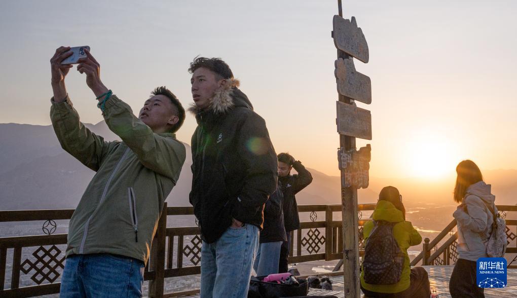 4月26日日出时分,游客在拉萨市南山公园拍照。
