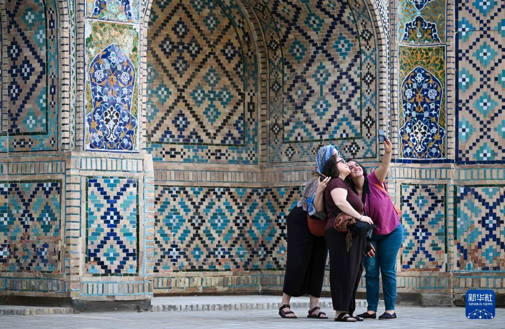4月24日,游客在乌兹别克斯坦布哈拉古城内自拍。