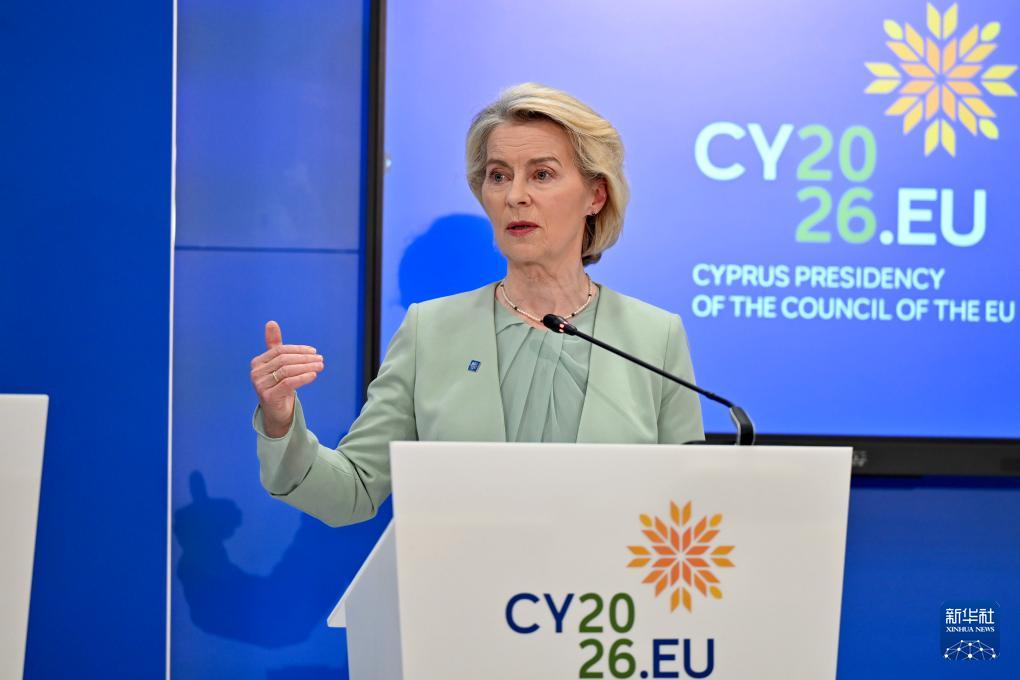 4月24日,在塞浦路斯首都尼科西亚,参加欧盟领导人非正式会议的欧盟委员会主席冯德莱恩会后出席新闻发布会。