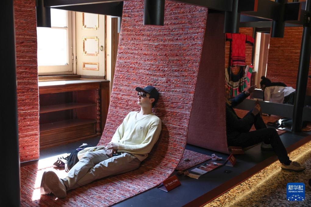 4月23日,在意大利米兰利塔宫,人们在《山海红瑶》展览上与展品互动。《山海红瑶》展出的家居产品以红瑶文化为灵感创作而来。