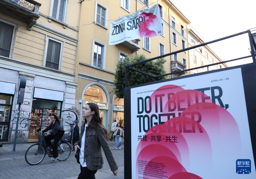 4月22日,在意大利米兰保罗·萨尔皮街区,人们经过米兰设计周“中国设计周”海报。