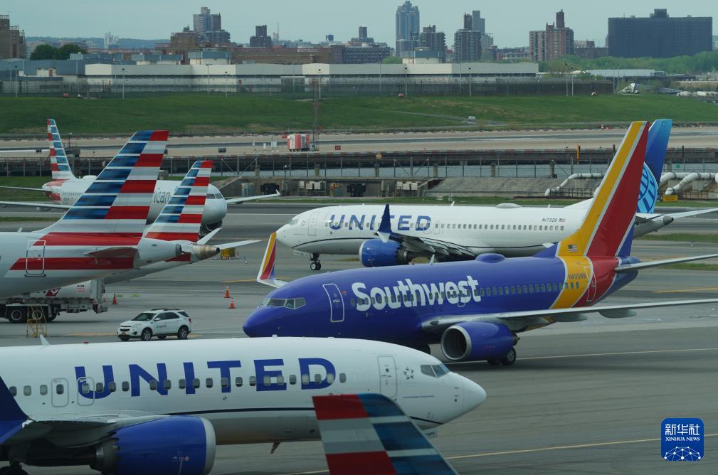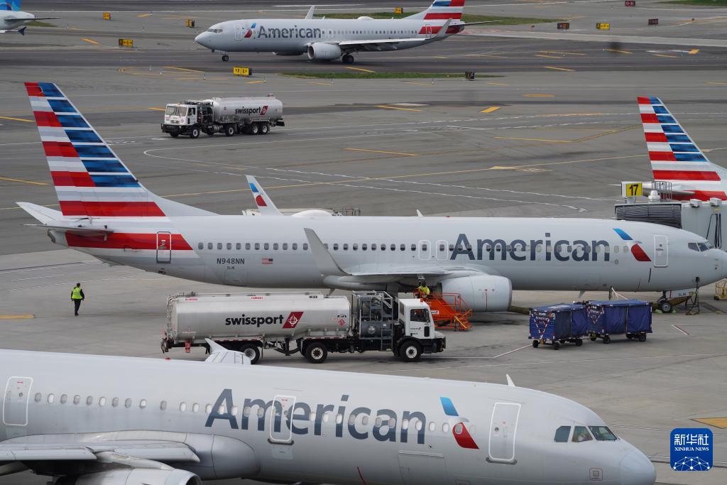 这是4月23日在美国纽约拉瓜迪亚机场拍摄的飞机。 多家美国航空运营商日前公布财报显示,由于中东战事导致航油价格飙升,这些运营商不得不通过上调机票价格、行李托运费和选座费,以及削减航班等措施应对冲击,但业绩前景仍然严重承压。 新华社记者 张凤国 摄