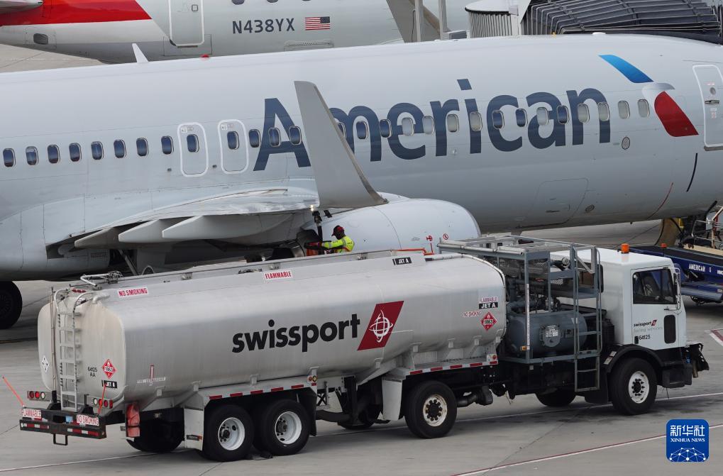 4月23日,在美国纽约拉瓜迪亚机场,工作人员为一架美国航空公司飞机加油。 多家美国航空运营商日前公布财报显示,由于中东战事导致航油价格飙升,这些运营商不得不通过上调机票价格、行李托运费和选座费,以及削减航班等措施应对冲击,但业绩前景仍然严重承压。 新华社记者 张凤国 摄