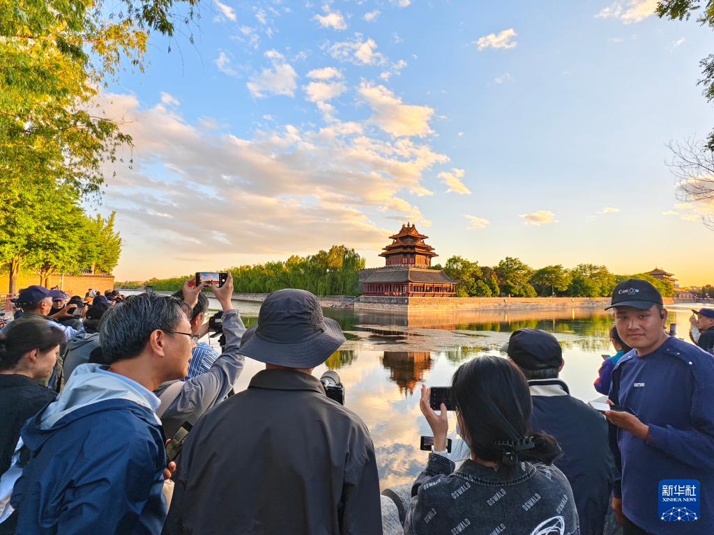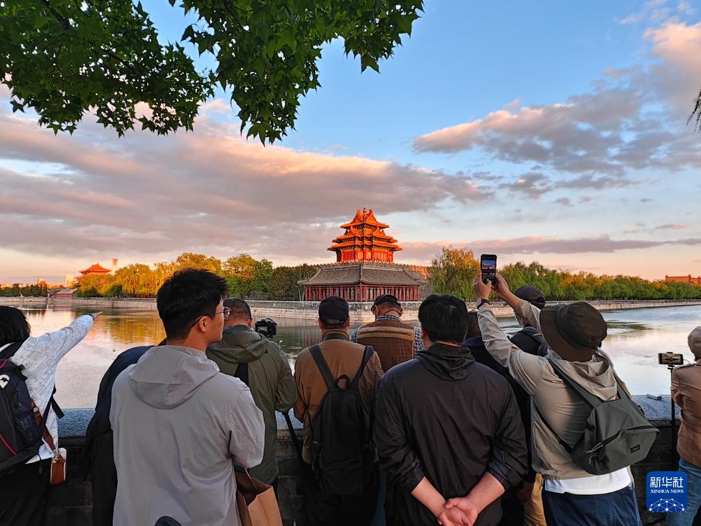 4月27日,游客欣赏故宫角楼(手机照片)。 4月27日,暮色中的故宫角楼景色如画,引人入胜。 新华社记者 徐金泉 摄