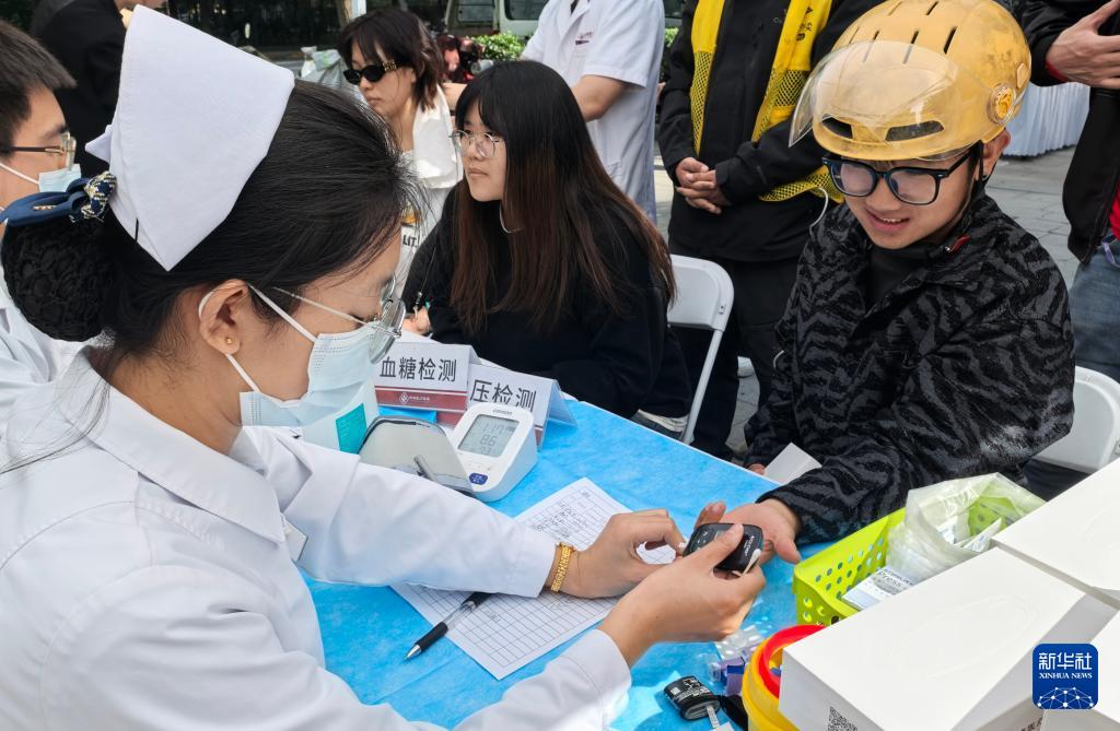 4月28日,志愿者在为快递员测量血糖。 4月28日,北京市朝阳区建外街道举办“集结爱心 暖心护航”主题市集活动,志愿者们为快递员等新就业群体的年轻人组织了义务中西医诊疗、理发、知识竞赛等活动。 新华社记者 李欣 摄