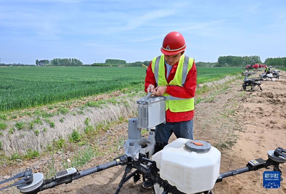4月28日,在青岛市西海岸新区大场镇绿色增粮先行区,一名飞手为植保无人机更换电池。