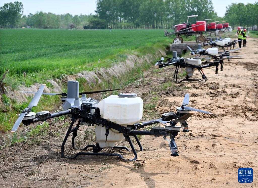 4月28日,在青岛市西海岸新区大场镇绿色增粮先行区,植保无人机准备开展“一喷三防”作业。
