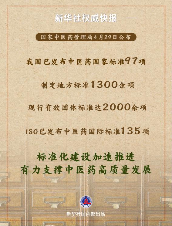 记者从国家中医药管理局4月29日举行的新闻发布会获悉,我国中医药标准化建设加速推进,已发布《中医病证分类与代码》《中医体质分类与判定》《针灸技术操作规范 第4部分:三棱针》《藏医疾病分类与代码》等中医药国家标准97项、中医药行业标准15项;各省区市已制定中医药地方标准1300余项;现行有效中医药团体标准已达2000余项;推动国际标准化组织(ISO)成立传统医药技术委员会,ISO已发布中医药国际标准135项。