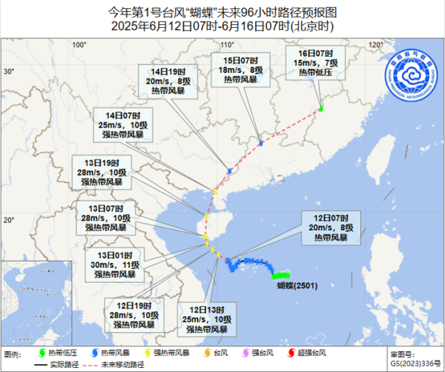 今年第1号台风“蝴蝶”将以每小时10公里左右的速度向西北转偏北方向移动,可能于13日凌晨到上午在海南陵水至乐东一带沿海登陆,14日白天在广东西部到广西沿海再次登陆。