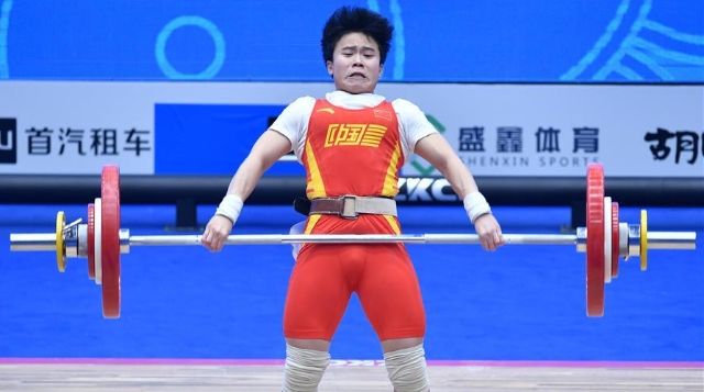 12月10日,中国选手侯志慧在49公斤级抓举比赛中给自己加油。 当日,在天津市举行的2019年“盛鑫”举重世界杯赛暨2020年东京奥运会资格赛女子49公斤级比赛中,中国选手侯志慧以抓举94公斤、挺举110公斤,总成绩204公斤夺得该级别抓举冠军,挺举和总成绩季军。 新华社记者李然摄