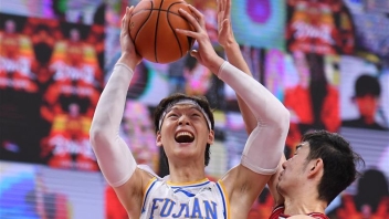 6月23日,福建豹发力队球员王哲林在比赛中。 当日,在广东东莞银行篮球中心举行的2019-2020赛季中国男子篮球职业联赛(CBA)复赛第一阶段比赛中,吉林九台农商银行队以112比107战胜福建豹发力队。 新华社记者梁旭摄