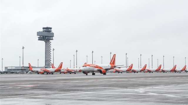 这是11月1日在德国首都柏林南郊的柏林-勃兰登堡机场内拍摄的易捷航空公司客机。 德国首都柏林的新机场柏林-勃兰登堡机场于10月31日正式启用,比原定时间晚了9年。据德国媒体报道,柏林-勃兰登堡机场于2006年正式开工,启用时间原定为2011年年底,最初预计耗资25亿欧元。因防火技术等各种问题,机场启用时间六度推迟,机场负责人几度更换,项目造价最终约为70亿欧元。 新华社记者 单宇琦 摄
