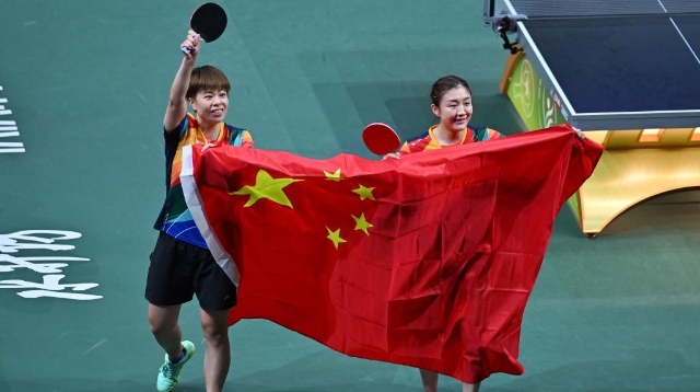 5月27日,陈梦/王艺迪(左)在比赛中。 当日,在南非德班进行的2023年世界乒乓球锦标赛女子双打决赛中,中国选手陈梦/王艺迪以3比0战胜韩国选手田志希/申裕斌,夺得冠军。 新华社记者 韩旭 摄