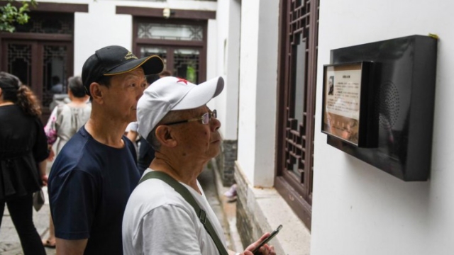 6月25日,游客在济南百花洲景区内参观一处红色打卡点。 暑期旅游旺季来临,山东省济南市历下区文化和旅游局深挖辖区济南古城、泉城路、大明湖等景点内红色旅游资源,打造集开放式、沉浸式、互动式于一体的“红色打卡点”“红色标识”,吸引游客前来观光打卡。 新华社记者 朱峥 摄