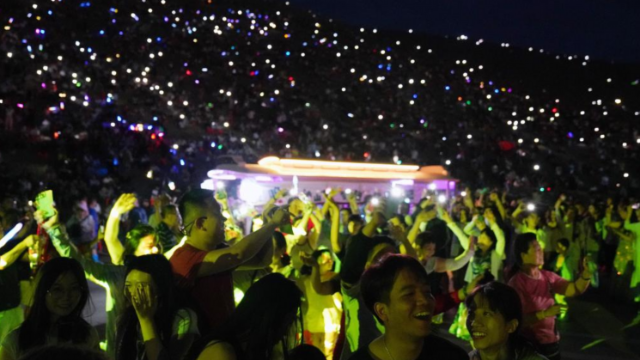 7月15日晚,游客在敦煌鸣沙山月牙泉景区参加万人星空演唱会。 连日来,甘肃省敦煌市鸣沙山月牙泉景区2024年万人星空演唱会持续火爆,吸引了大量游客前来体验。每当夜幕降临,演唱会启幕,游客聚集在沙坡上跟随音乐尽情歌唱,同时打开手机闪光灯,与月牙泉夜景交相辉映。 新华社记者 马宁 摄