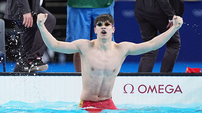 7月31日,潘展乐在比赛后庆祝夺冠。新华社记者 夏一方 摄