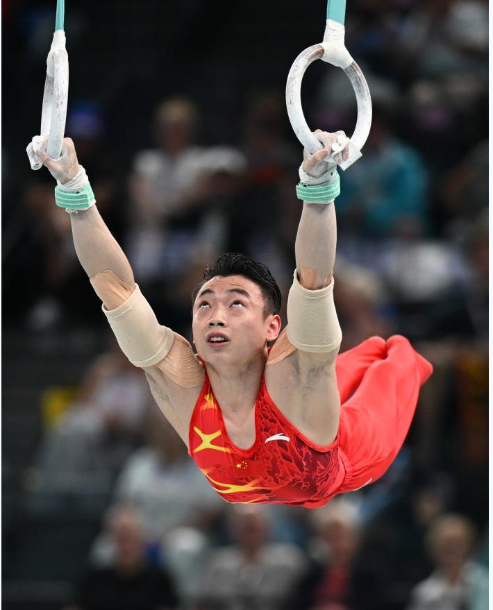 8月4日,中国选手刘洋在比赛中。 当日,在巴黎奥运会体操男子吊环决赛中,中国选手刘洋获得冠军,邹敬园获得亚军,希腊选手佩德罗尼亚斯获得季军。 新华社记者 程敏 摄